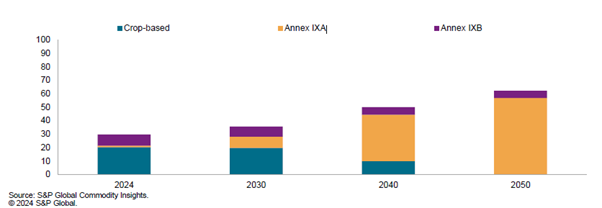 The emergence of a sustainable fuel marketplace is central to both scenarios, albeit with different emphasis. Biofuels are expected to play a crucial role, particularly in the More Molecule scenario. The study analyzes the potential supply of biofuels from various feedstocks, including Annex IXA (advanced biofuels), Annex IXB (waste-based biofuels), and crop-based sources. While crop-based biofuel production is projected to decline to zero by 2050 to meet GHG reduction targets, the potential availability of advanced and waste-based biofuels through EU domestic production could reach 137 MMtoe by 2050 with improvements in biomass collection and R&D. The demand for biofuels in the More Molecule scenario approaches the upper range of this estimated potential, indicating a greater reliance on their supply. SPGCI's database of biofuel plants provides insights into current and planned production capacity in the EU+ up to 2030, showing a total biofuel capacity of 36.05 MMtoe by then. Achieving the long-term biofuel supply, especially for advanced feedstocks, will require significant improvements in biomass mobilization and R&I.