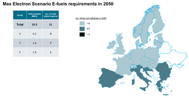 The study also considers the distribution of bio- and e-fuel production capacity across different EU+ country groupings. These projections, while anonymized at a country level, indicate where investments in sustainable fuel production might be concentrated.